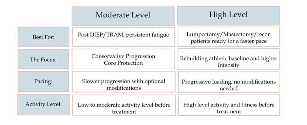 The chart above details the clinical and physical milestones for each track. Generally, Moderate is best for post-reconstruction with tissue flap (DIEP/TRAM) or those managing persistent fatigue, while High is for those ready for a faster, more athletic pace. Still have questions? Send me an email at pbcrehab@gmail.com—I’d be happy to help you decide.